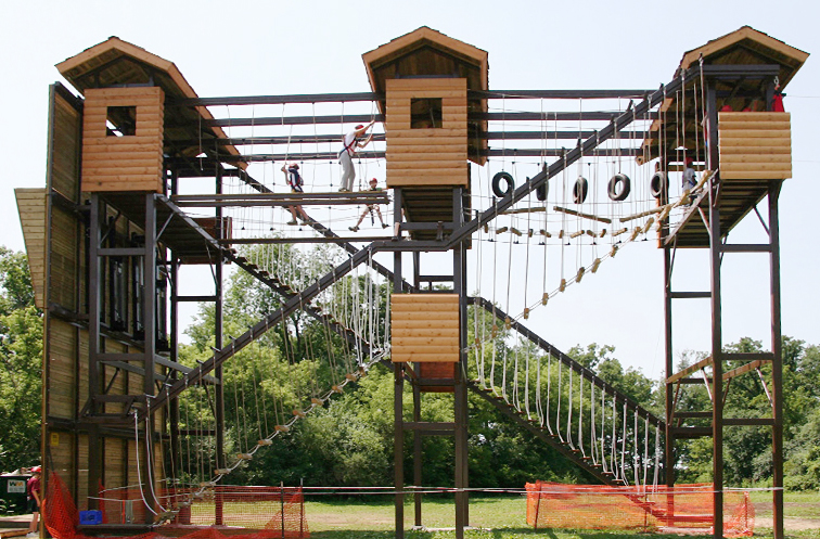 “勇士之橋・多層闖關(guān)塔” 是專為戶外營(yíng)地、研學(xué)基地及主題樂園打造的模塊化拓展綜合體。它以仿木屋造型的鋼結(jié)構(gòu)平臺(tái)為骨架,搭建起多層立體關(guān)卡矩陣,融合了輪胎橋、繩網(wǎng)棧道、平衡索橋等豐富挑戰(zhàn)形式,讓體驗(yàn)者在層層遞進(jìn)的闖關(guān)過程中,鍛煉勇氣、平衡感與團(tuán)隊(duì)協(xié)作能力。