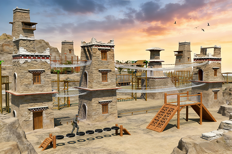這是一款沉浸式紅色主題室外拓展游樂設(shè)備,以長(zhǎng)征途中的雪山藏寨、碉樓關(guān)卡為設(shè)計(jì)靈感,還原了歷史場(chǎng)景中的碉樓防御工事、鐵索橋與山地障礙。主體采用仿石混凝土打造碉樓與山體造型,搭配防腐實(shí)木關(guān)卡與高強(qiáng)度網(wǎng)道,既還原了歷史場(chǎng)景的厚重質(zhì)感,又保障了結(jié)構(gòu)穩(wěn)固與游玩安全。設(shè)備集高空穿越、地面障礙挑戰(zhàn)、歷史場(chǎng)景體驗(yàn)于一體,適用于紅色教育基地、研學(xué)營(yíng)地、文旅景區(qū),讓參與者在沉浸式拓展中重溫長(zhǎng)征精神,鍛煉體能、勇氣與團(tuán)隊(duì)協(xié)作能力,兼具教育意義與游樂體驗(yàn)。