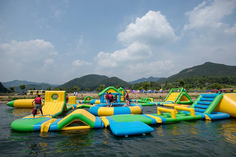 這是一款依托開闊湖面打造的無動力水上充氣闖關(guān)設(shè)備,由黃、綠、藍(lán)三色充氣模塊拼接而成,包含滑梯、障礙浮臺、攀爬通道等豐富關(guān)卡,造型明快活潑,與湖光山色形成清新治愈的視覺效果。