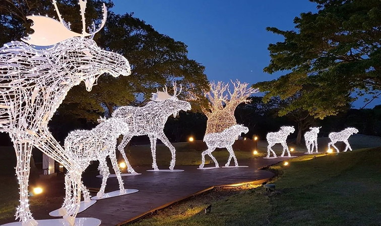 這是一款以鹿群遷徙為主題的夜間發(fā)光藝術(shù)裝置,采用金屬線材編織出動(dòng)態(tài)感十足的鹿形雕塑,內(nèi)置暖柔光源。夜晚點(diǎn)亮?xí)r,銀白的鹿群仿佛穿梭于林間,與草地、樹木背景自然融合,兼具藝術(shù)感與治愈氛圍。