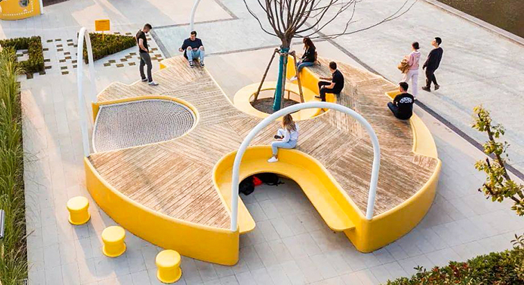 這是一款兼具休憩、社交與輕互動功能的公共景觀裝置,以流暢的曲線造型為核心,黃色玻璃鋼底座搭配木質(zhì)防滑面板,圍繞中心樹池打造出多層次的坐臥空間,還融入了迷你滑梯模塊,視覺上充滿活力與現(xiàn)代感。