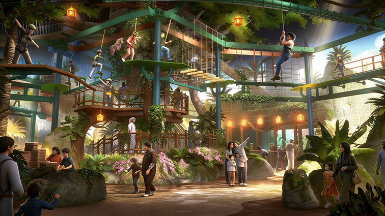 “地心奇境・雨林探險堡” 是專為室內(nèi)文旅綜合體、高端商場打造的全天候沉浸式拓展旗艦項目。它突破戶外環(huán)境限制,以 “地心雨林” 為主題,構(gòu)建出多層立體的空中探險矩陣,將懸空步道、繩網(wǎng)攀爬、滑索穿越等豐富關(guān)卡,與仿真綠植、主題造景、氛圍光影深度融合,打造出可風(fēng)雨無阻體驗的 “城市冒險綠洲”。